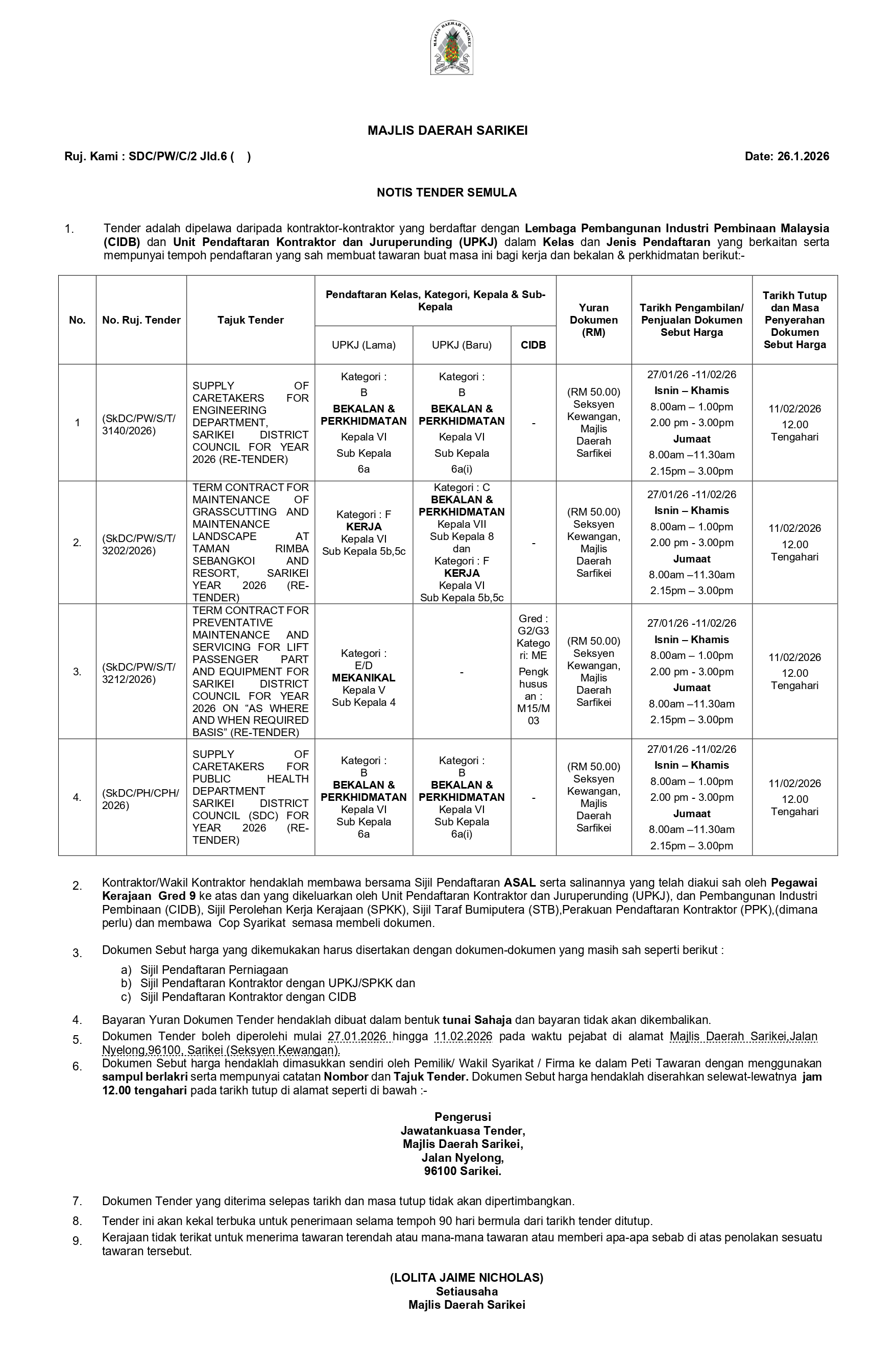 | Notis Tender semula bahagian Kejuruteraan | 12:00 tengahari pada 11.02.2025 (Rabu) |