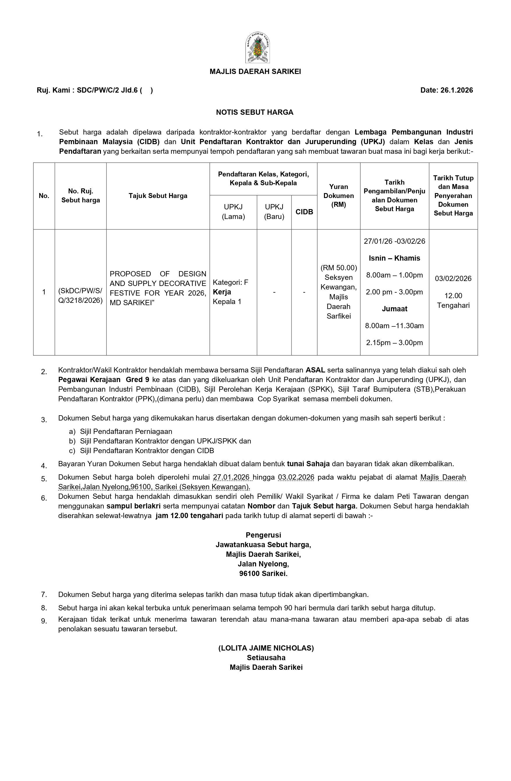 | Notis Sebut harga bahagian Kejuruteraan | 12:00 tengahari pada 03.02.2026 (Selasa) |