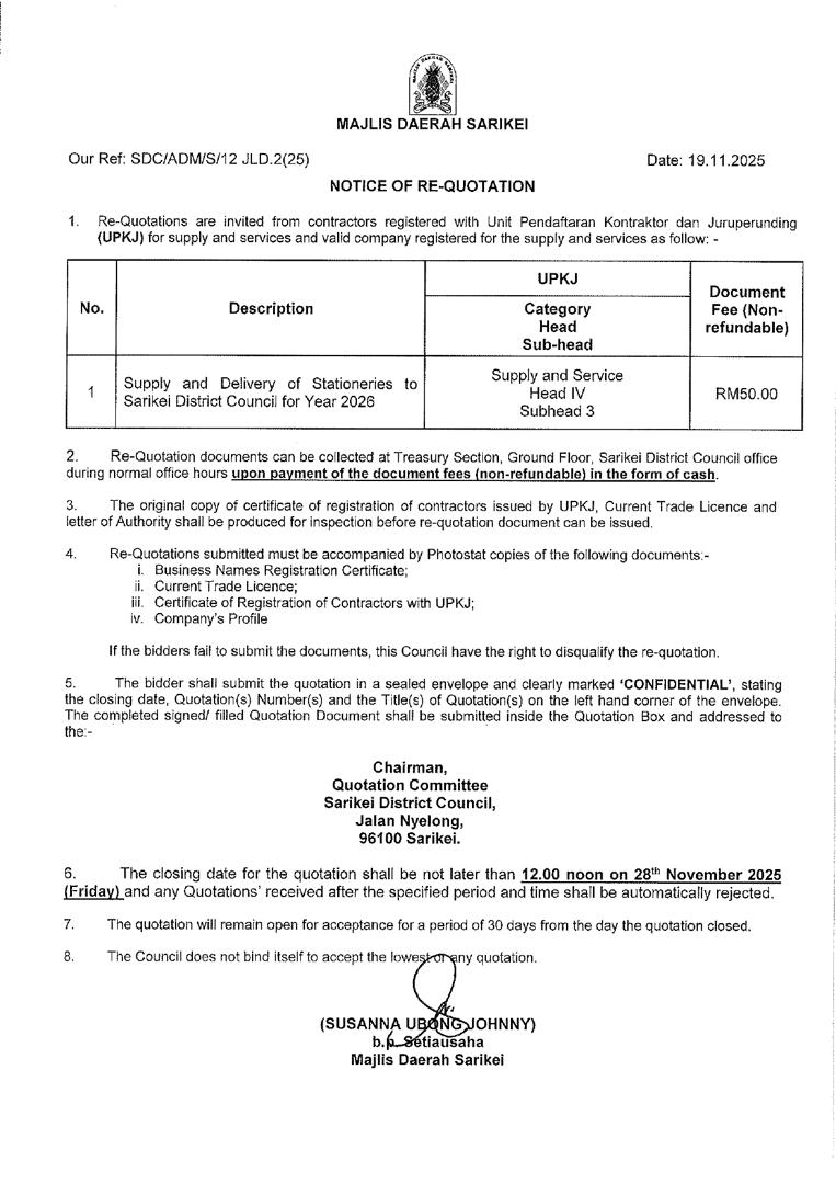 | Membekal dan Menghantar Alat Tulis kepada Majlis Daerah Sarikei bagi Tahun 2026 (Sebutharga Semula) | 12:00 tengahari pada 28.11.2025 (Jumaat) |