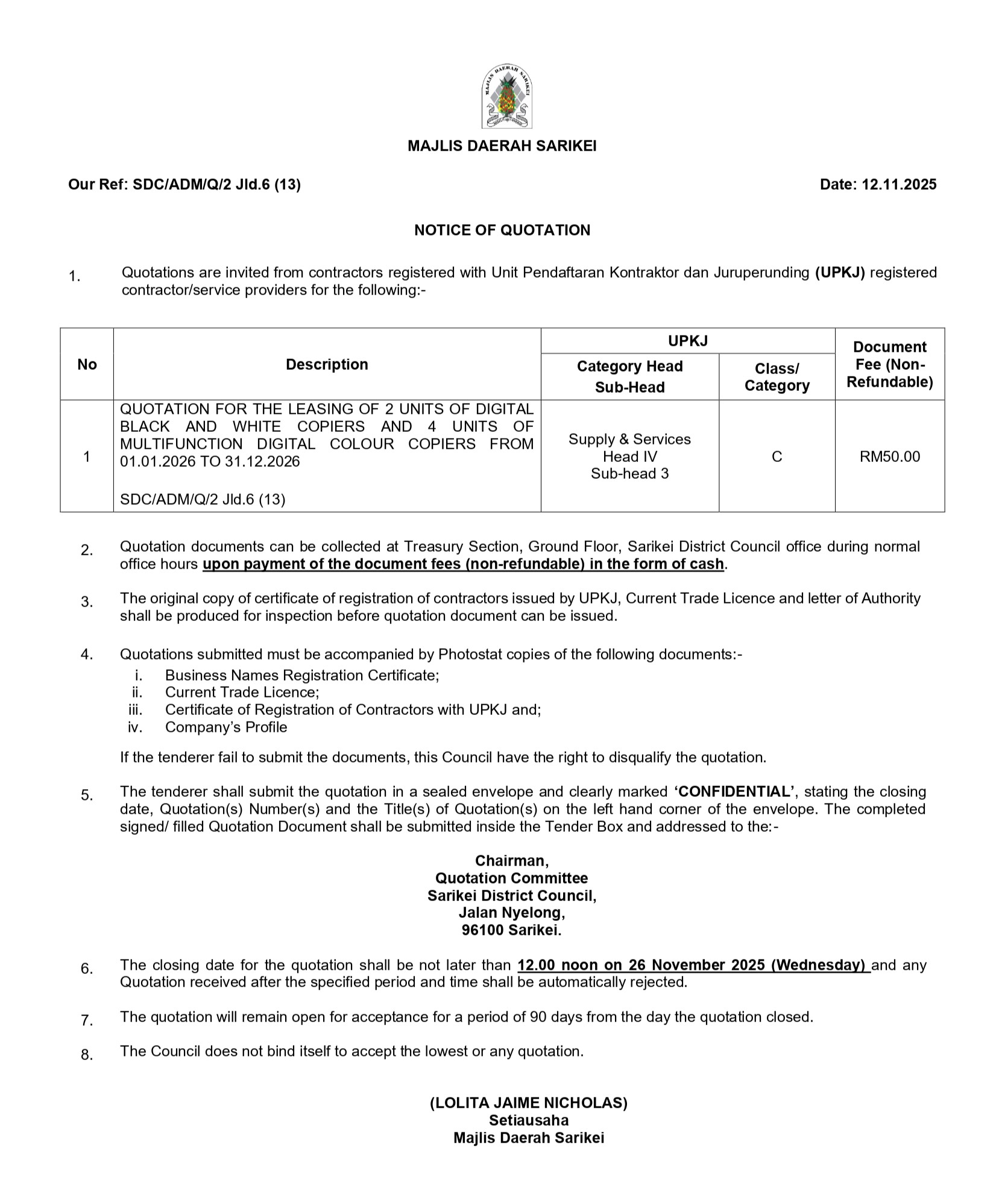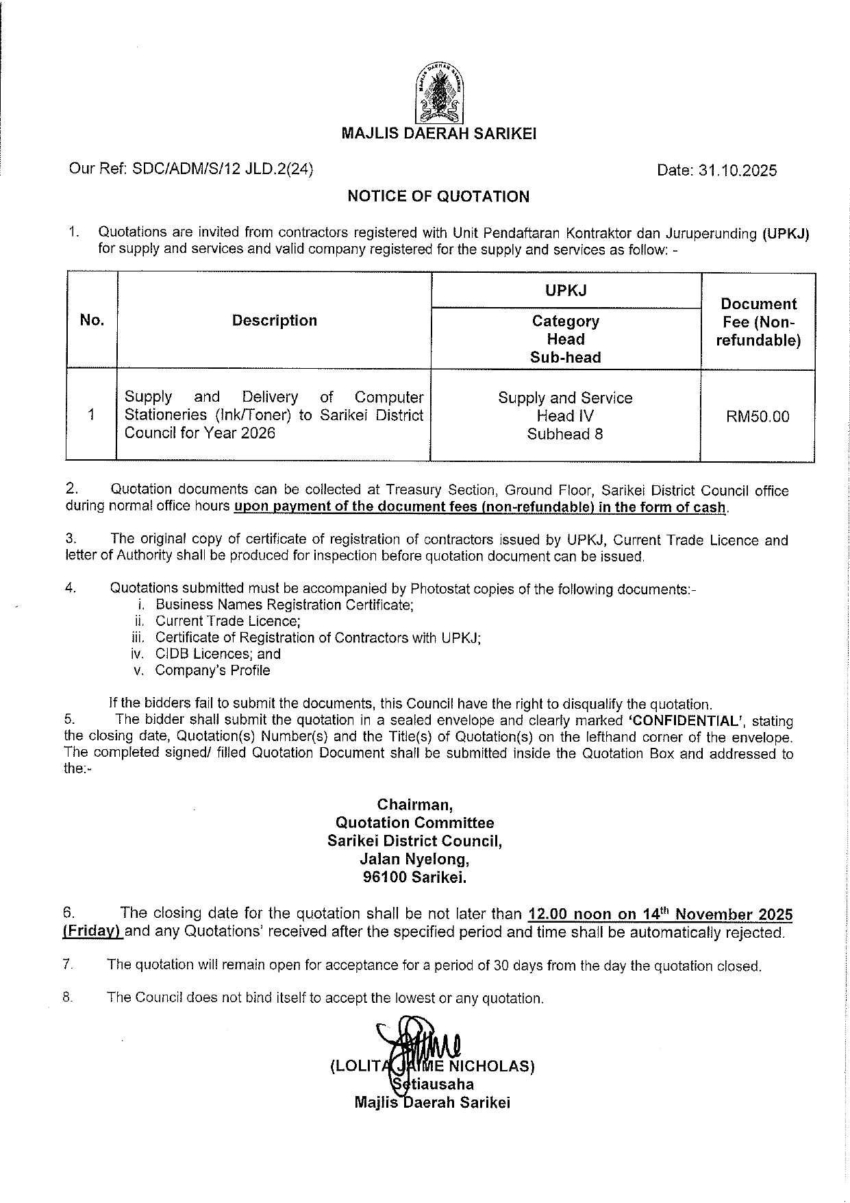| Membekal dan Menghantar Alat Tulis Komputer (Dakwat/Toner) kepada Majlis Daerah Sarikei bagi Tahun 2026 (Sebutharga Semula) | 12:00 tengahari pada 28.11.2025 (Jumaat) |