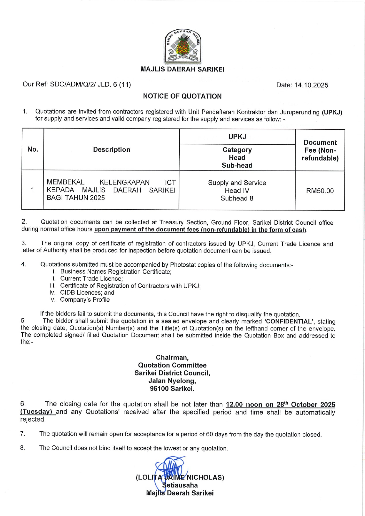 | Membekal kelengkapan ICT kepada Majlis Daerah Sarikei bagi tahun 2025 | 12:00 tengahari pada 28.11.2025 (Jumaat) |